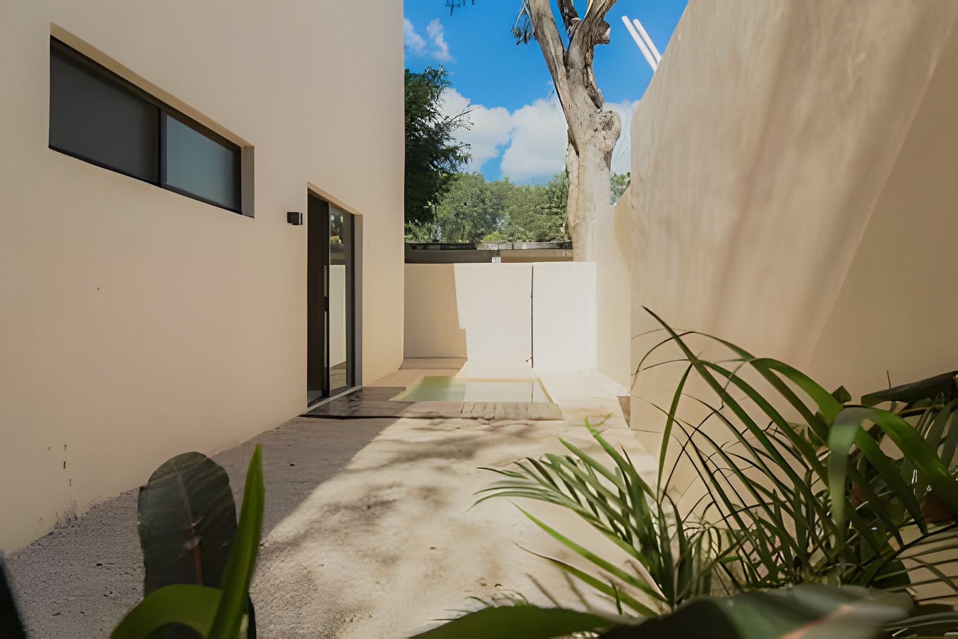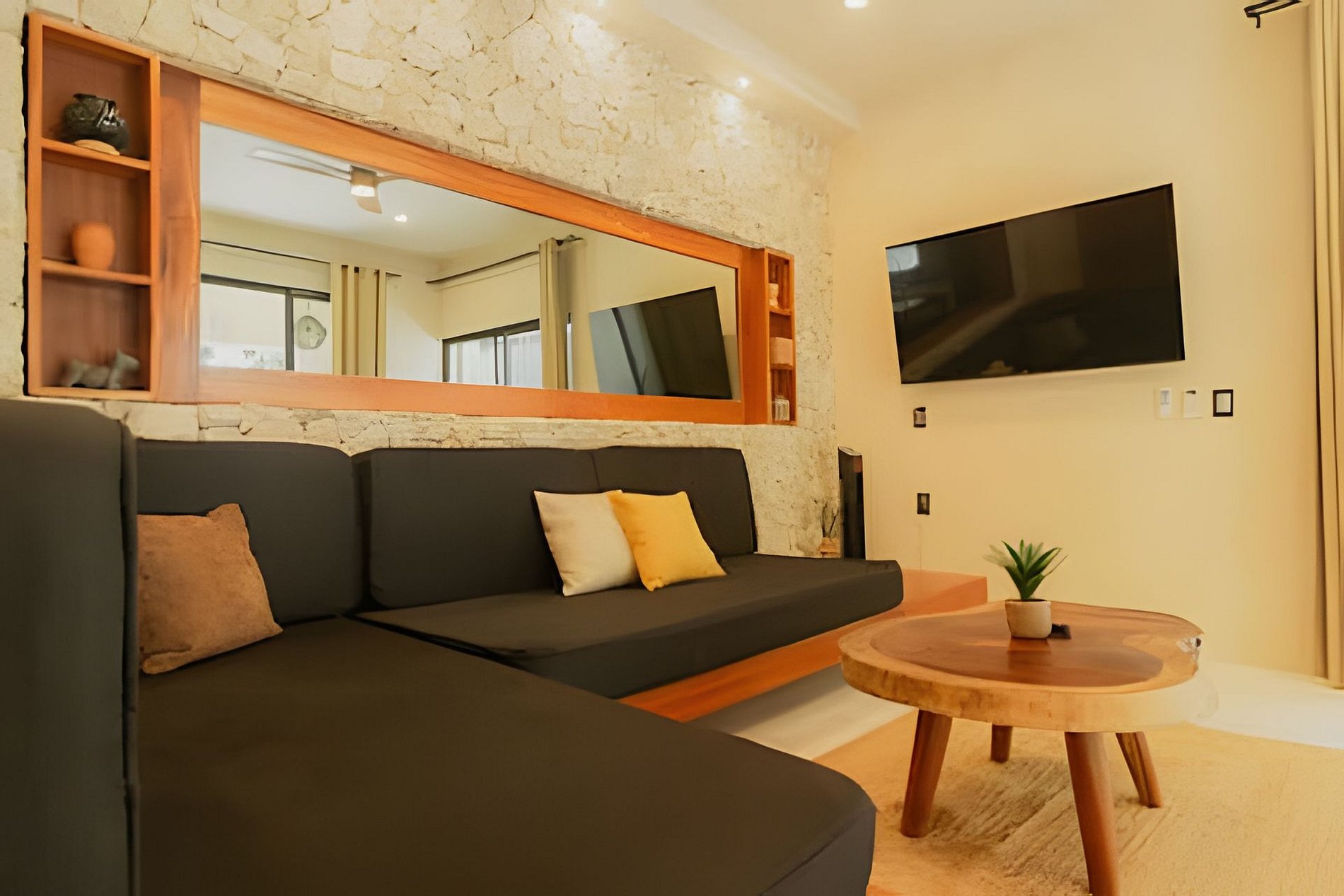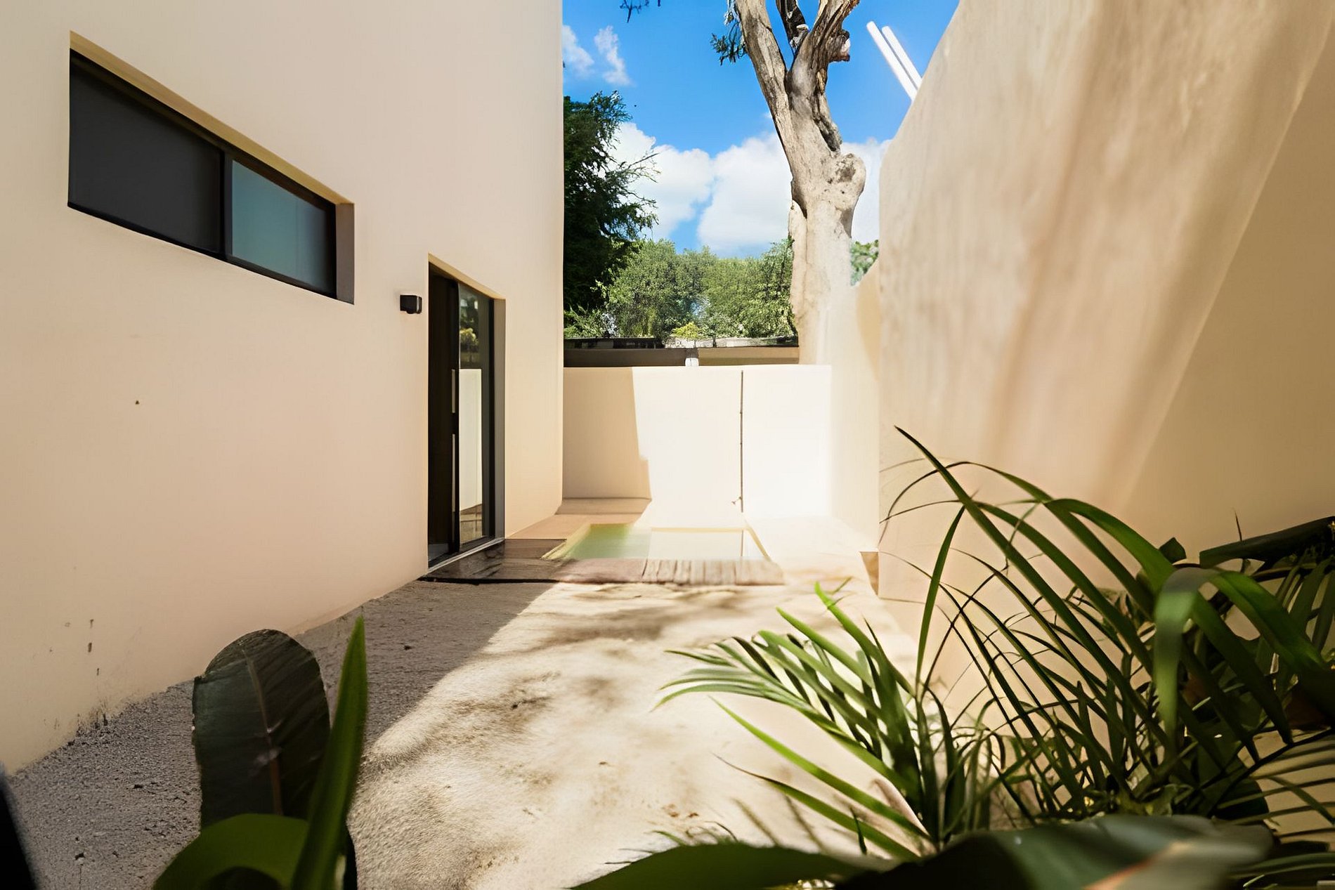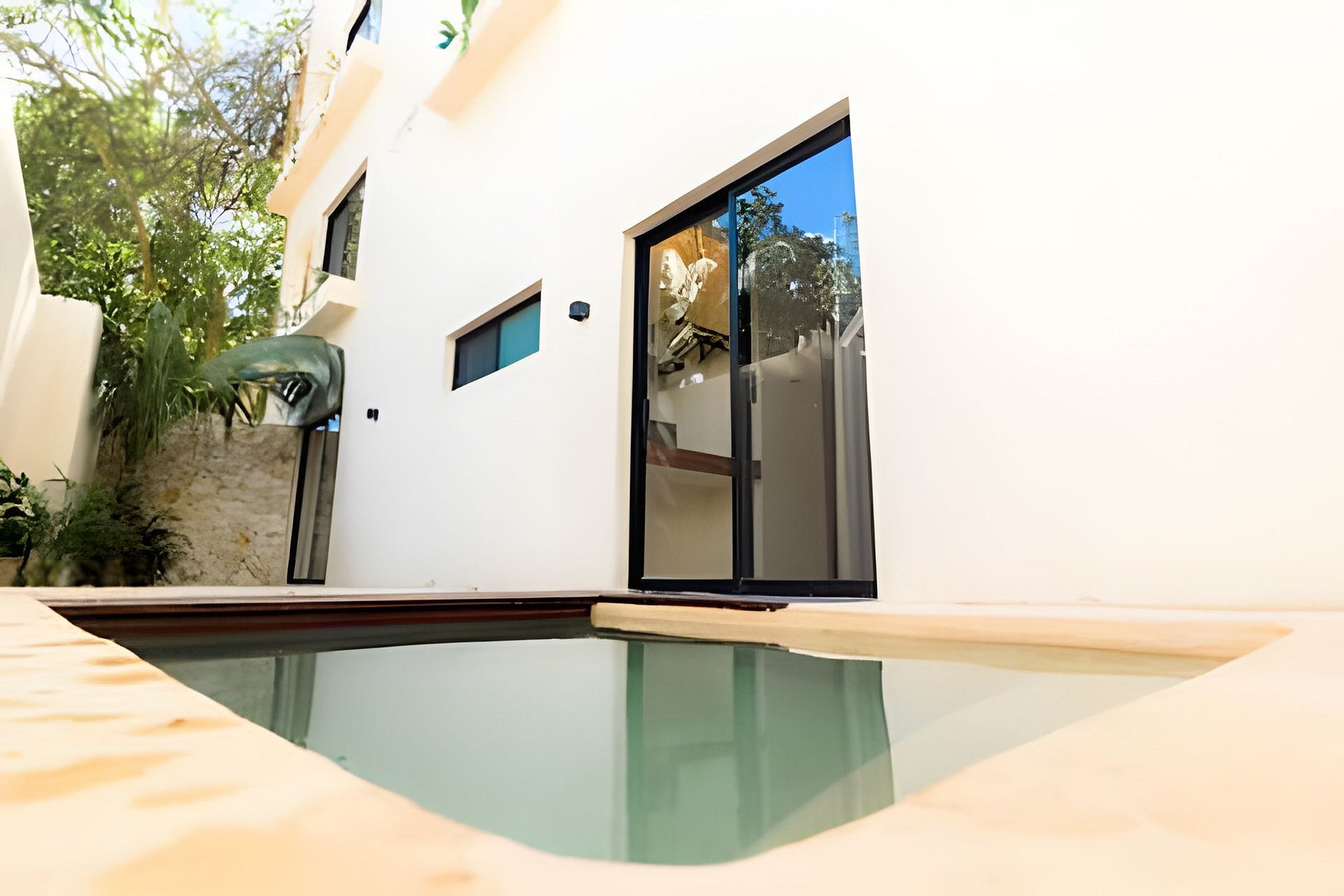 El departamento se encuentra en planta baja dentro de un edificio de reciente construcción. Cuenta con espacios amplios, buena ventilación y distribución funcional. Las habitaciones están equipadas con camas King para mayor comodidad. La alberca privada permite disfrutar el espacio sin compartir áreas con otros huéspedes.