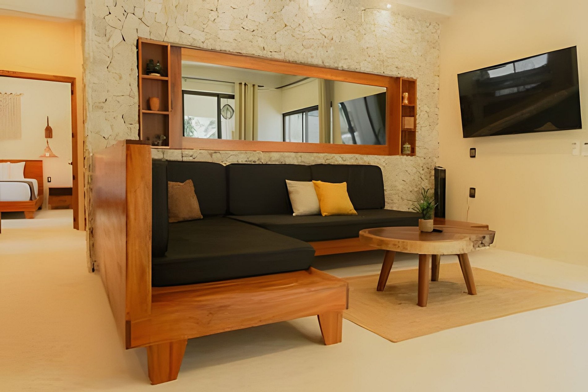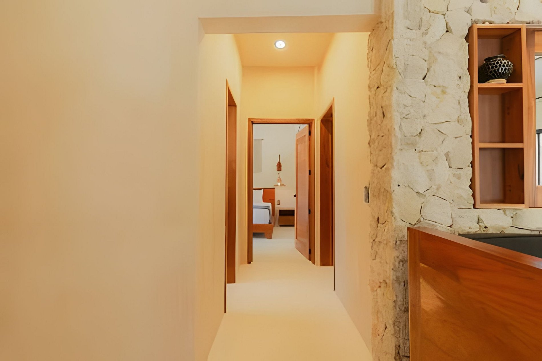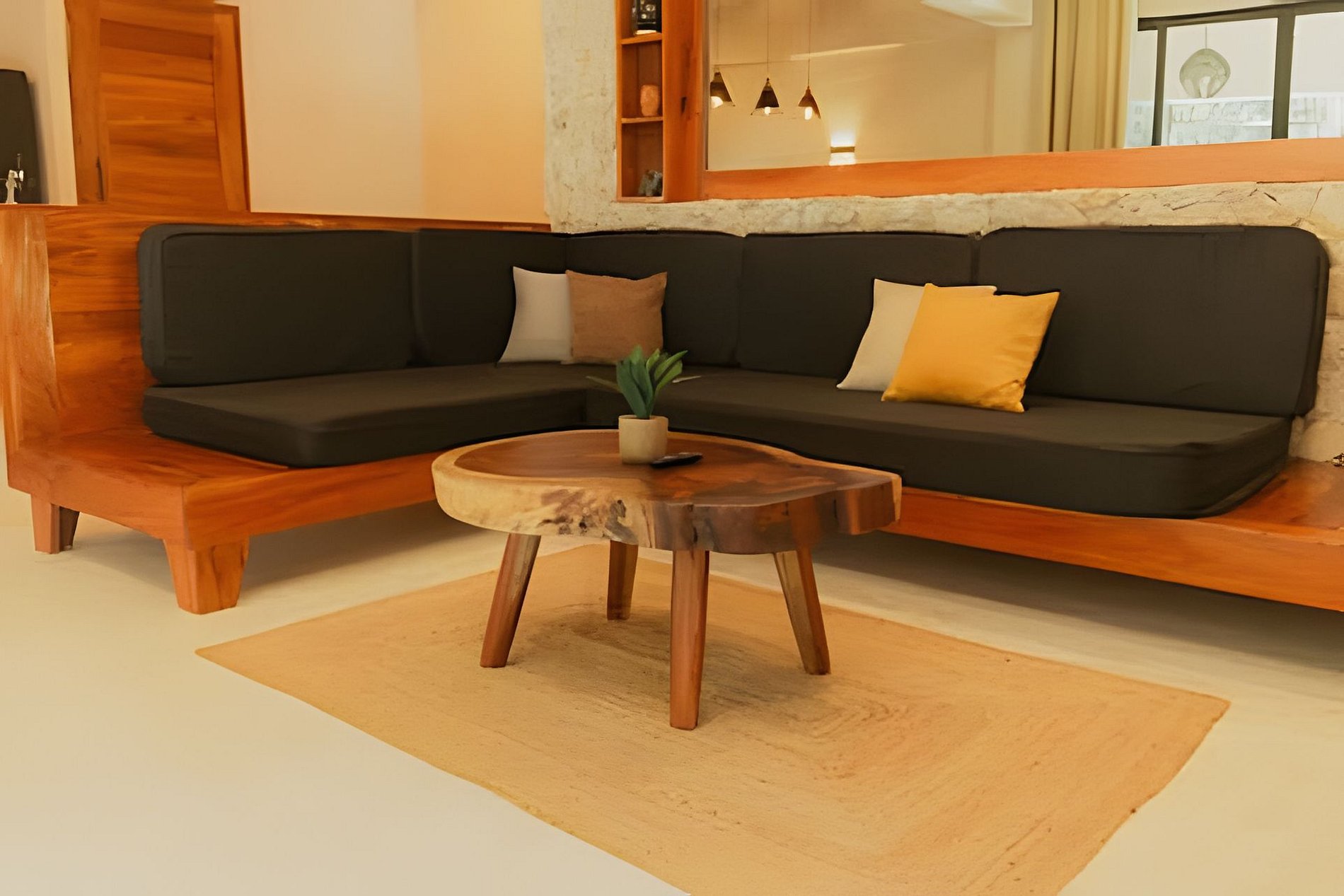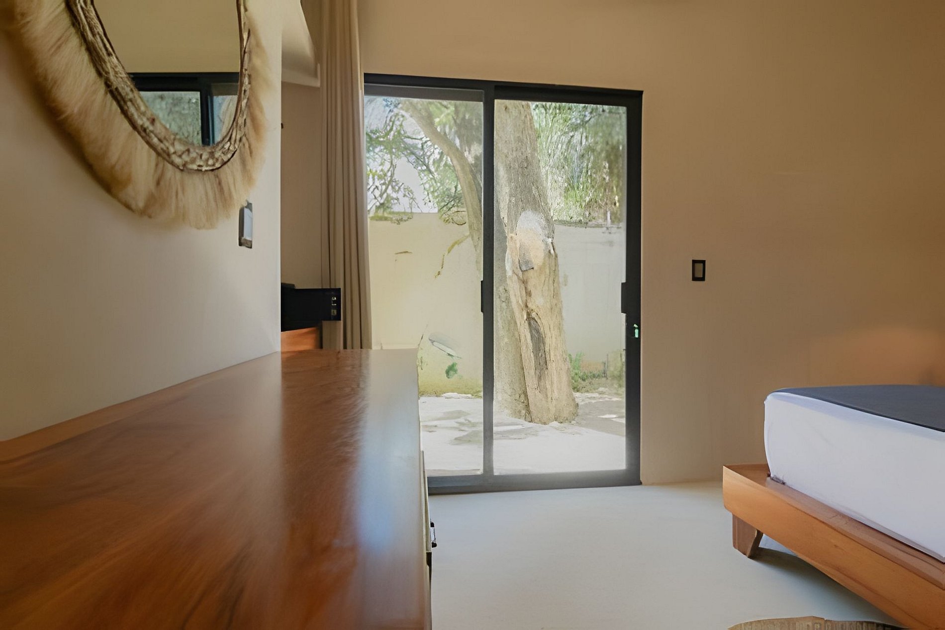 El departamento se encuentra en planta baja dentro de un edificio de reciente construcción. Cuenta con espacios amplios, buena ventilación y distribución funcional. Las habitaciones están equipadas con camas King para mayor comodidad. La alberca privada permite disfrutar el espacio sin compartir áreas con otros huéspedes.