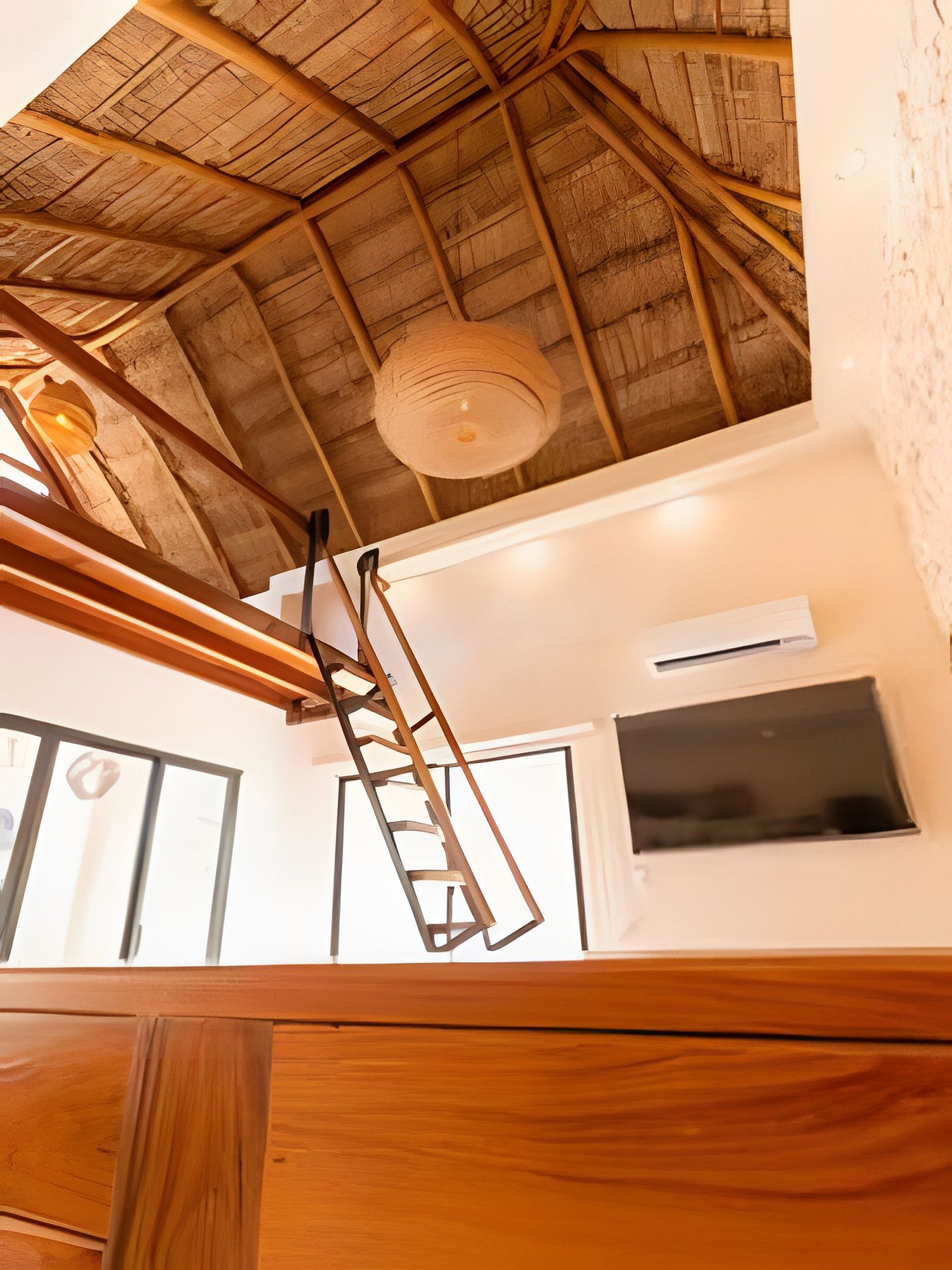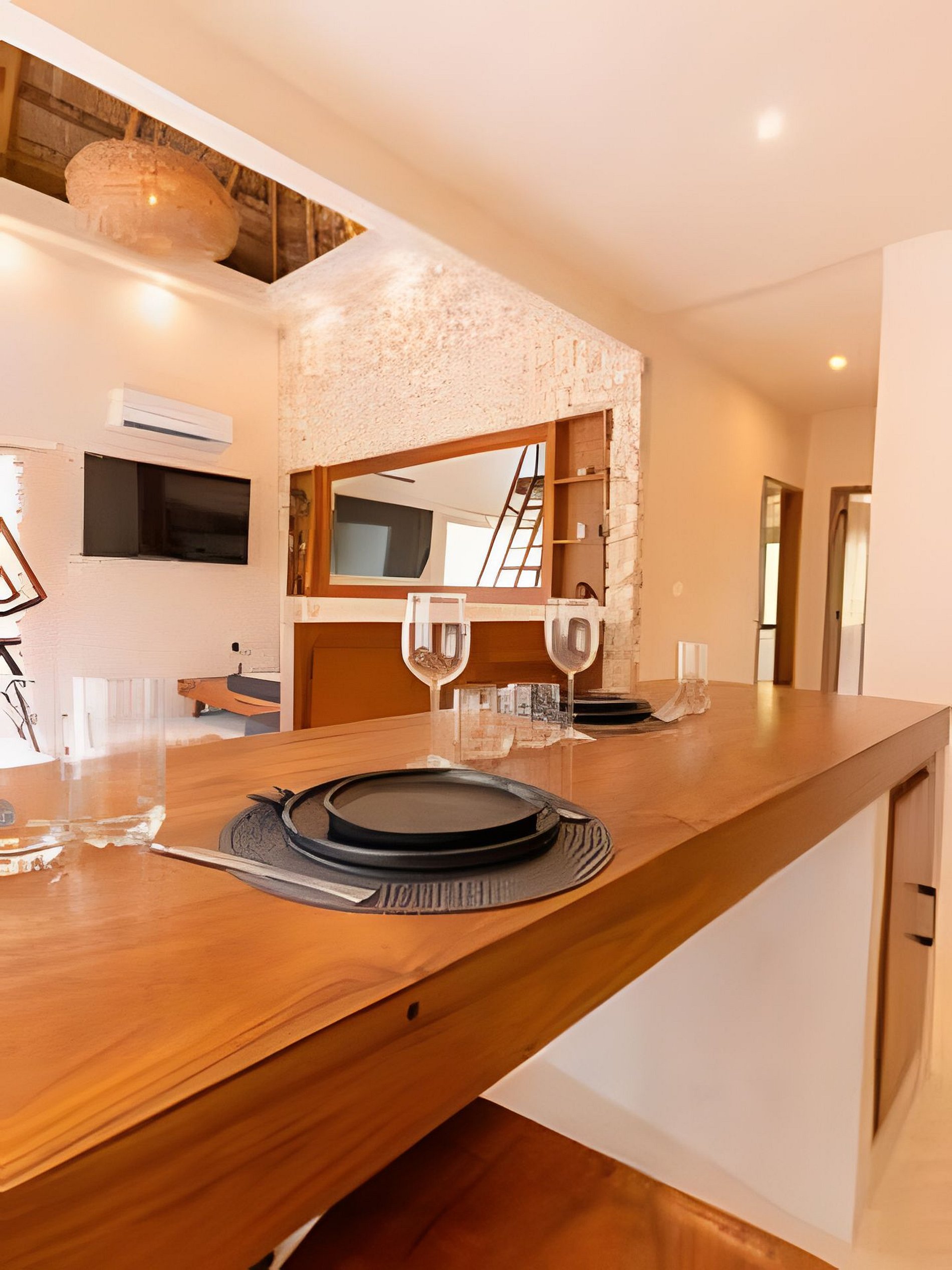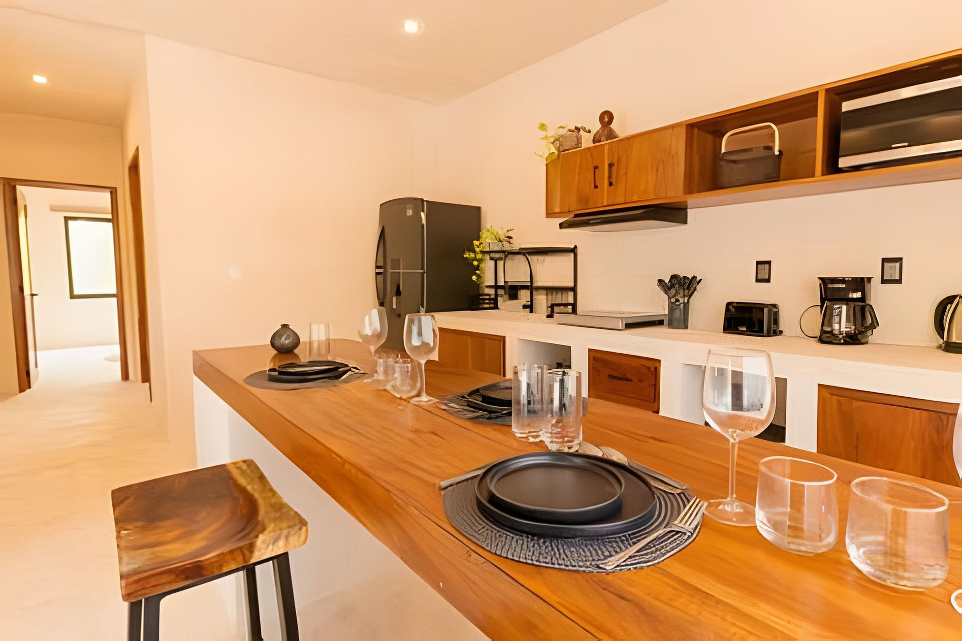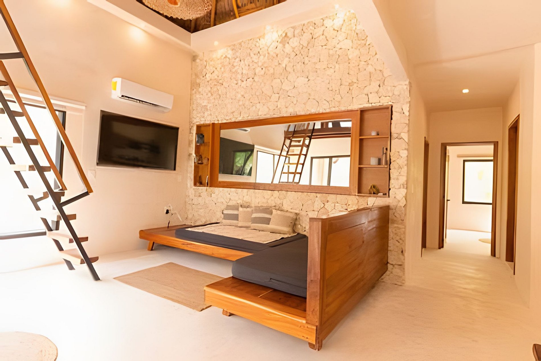 Este departamento cuenta con dos habitaciones totalmente equipadas, la habitación principal cuenta con una cama king size, A/C y baño privado completo con tina. La segunda habitación cuenta también con una cama king size, A/C y comparte el baño completo con tina con las áreas comunes. La cocina está totalmente equipada, refrigerador, microondas, vajilla, electrodomésticos y cristalería. En la estancia puedes disfrutar de una doble altura con techo de palapa, lo que le proporciona al departamento mucha frescura, cuenta con A/C, además de tener acceso directo a una terraza y a un tapanco pensado para actividades de yoga y meditación. La estancia cuenta con dos sillones que pueden ser utilizados como cama individual cada uno.